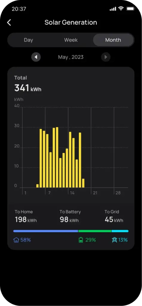 Mit der benutzerfreundlichen EcoFlow-App und dem Webportal behalten Sie den Überblick über Ihren Stromverbrauch, Ihre Solareinspeisung und Ihren Batteriespeicher in Echtzeit. Priorisieren Sie die Solarenergienutzung und laden Sie Ihre Batterie automatisch mit überschüssiger Energie für den nächtlichen Gebrauch auf.