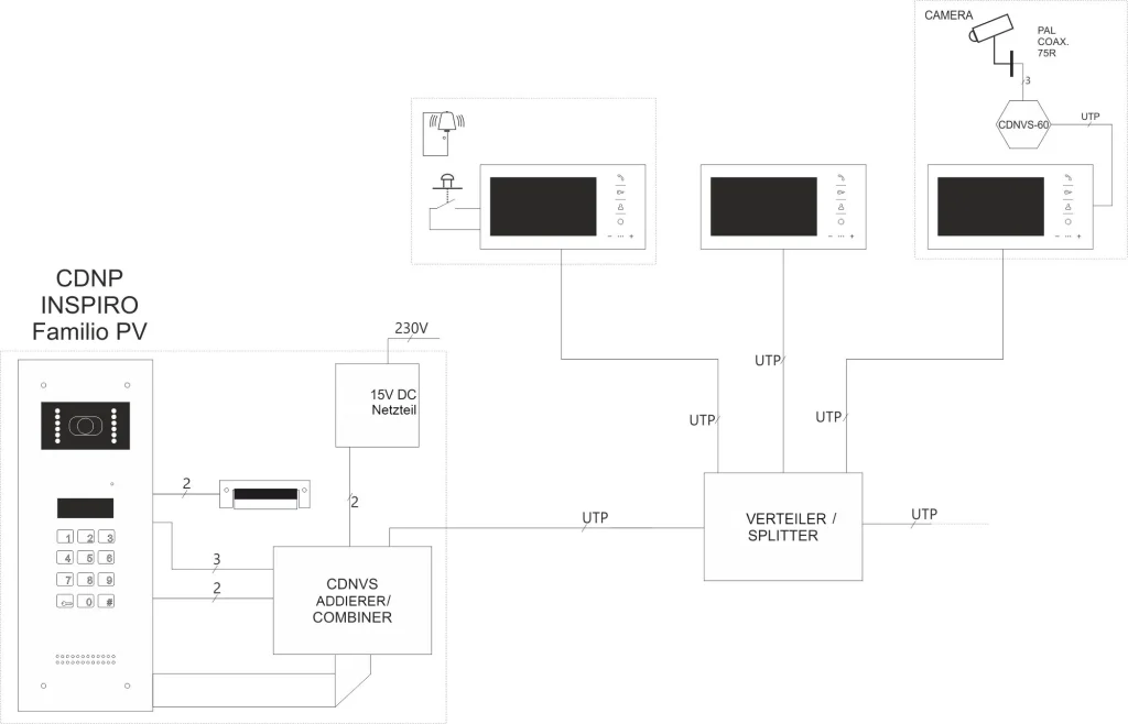 | Eingänge | 1 x Rj45 Buchse 3 x ARK Schraubanschluss Anschluss der Audioleitung und Spannungsversorgung 1 x ARK „RING“ Schraubanschluss Anschluss des Schließerkontaktes (NO) zB „Klingel“ Taster – Klingelfunktion an der Tür (aktiviert nach einem Kurzschluss zu GND der Anlage) 1 x zum Anschluss einer zweiten unabhängigen Kamera 100 Ohm / 1Vp-p, differentiell / UTP (z.B. CDNVS-60 verwenden) |