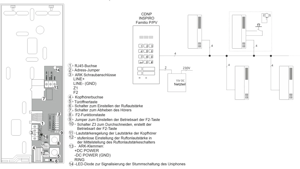 | Eingänge | 1x RJ45 Buchse, ARK Schraubanschlüsse 1x Schließer (NO) für die Klingel |