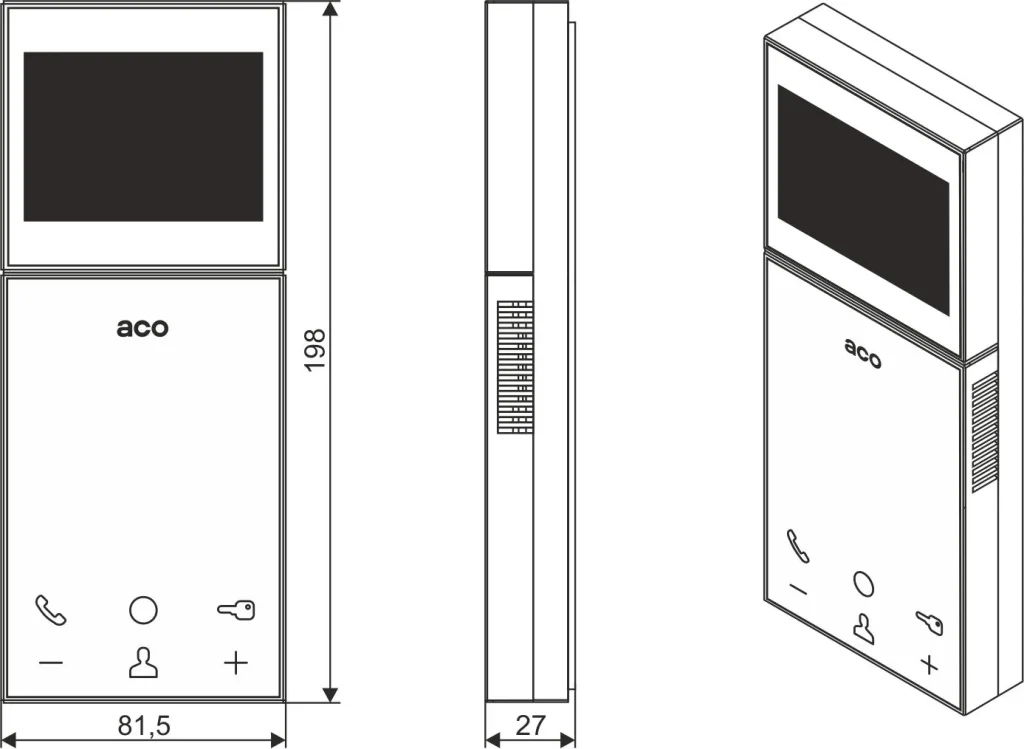 Der Videoreceiver zeichnet sich durch ein minimalistisches Design sowie Einfachheit und Intuitivität in Bedienung und Montage aus. Es hat eine flache Vorderseite mit einem 3,5-Zoll-Farbdisplay und taktilen und hintergrundbeleuchteten Funktionssymbolen. Es ist ein Freisprechempfänger und hat eine sehr gute Tonqualität. Die wichtigsten Funktionen sind: Gegensprechanlage (Möglichkeit, innerhalb des Gebäudes zwischen Empfängern zu klingeln), melodische Klingel, Öffnen der Tür und des zweiten Tors ohne Verbindungsaufbau, automatische Öffnungsfunktion, Türklingelfunktion, optische Signalisierung der Stummschaltung Klingeln und Klingeln, 7-stufige Klingeleinstellung (Klingeln und Rufen), integrierter universeller Relaisausgang, der über ein Touch-Symbol aktiviert wird (z. B. für die Steuerung der Hausautomation). Der Monitor gehört zur Gruppe der PRO-Receiver der 3 des Systems) und Software-Updates. Produkte der PRO-Gruppe der 3. Generation werden ständig weiterentwickelt, und dank Software-Updates stehen alle neuen Funktionalitäten und Möglichkeiten auch denjenigen zur Verfügung, die früher Produkte gekauft haben. Funktioniert mit Geräten der Marke ACO, die in PRO- und PRO-A-Systemen betrieben werden.