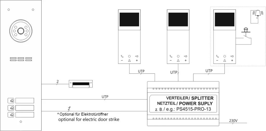 | Eingänge | 1 x RJ45 Buchse (Anschluss des PRO-Systembusses) 5 x Schraubverbindungen (Anschluss des PRO-Systembusses): – Anschluss Audiosignal: “ LINE“ – Stromversorgungsanschluss: „+DC“ und „-DC“ – Videosignalanschluss: „V+“ und „V-“ 1 x „RING“ Schraubanschluss: – Schließer (Schließer) Anschluss, z.B. „Klingel“ Taster – Türklingelfunktion (aktiviert nach Kurzschluss nach GND der Anlage) |