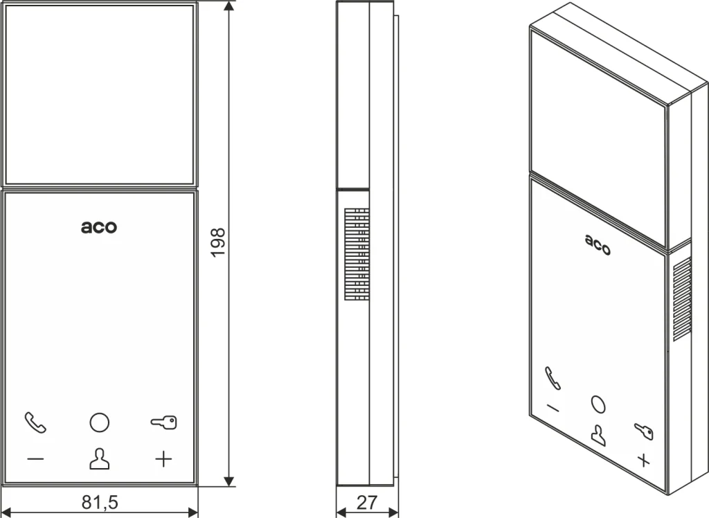 Der Empfänger zeichnet sich durch ein minimalistisches Design, Einfachheit, intuitive Bedienung und Installation sowie die Möglichkeit aus, einen voll funktionsfähigen Videoempfänger auszutauschen, was selbst von einem normalen Benutzer auf sehr einfache Weise durchgeführt werden kann. Entfernen Sie dazu einfach die Kappe und montieren Sie das 3,5 „Anzeigemodul: UP800 LCD 3,5“. Der Empfänger hat eine flache Vorderseite mit taktilen und hinterleuchteten Funktionssymbolen. Es ist ein Freisprechempfänger und hat eine sehr gute Tonqualität. Die wichtigsten Funktionen sind: Gegensprechanlage (Möglichkeit, innerhalb des Gebäudes zwischen Empfängern zu klingeln), melodische Klingel, Öffnen der Tür und des zweiten Tors ohne Verbindungsaufbau, automatische Öffnungsfunktion, Türklingelfunktion, optische Signalisierung der Stummschaltung Klingeln und Klingeln, 7-stufige Klingeleinstellung (Klingeln und Rufen), integrierter universeller Relaisausgang, der über ein Touch-Symbol aktiviert wird (z. B. für die Steuerung der Hausautomation). Der Empfänger gehört zur PRO-Gruppe der 3. Generation, was ein verbessertes Gerätedesign bedeutet, um noch mehr Zuverlässigkeit und Leistungsfähigkeit zu gewährleisten: inkl. Unterstützung für größere (längere) Installationen, größere Anzahl von Abonnenten, Remote-Geräteverwaltung (von überall im System) und Softwareaktualisierung. Produkte der PRO-Gruppe der 3. Generation werden ständig weiterentwickelt, und dank Software-Updates stehen alle neuen Funktionalitäten und Möglichkeiten auch denjenigen zur Verfügung, die früher Produkte gekauft haben. Sie arbeiten mit Geräten der Marke ACO zusammen, die in PRO- und PRO-A-Systemen arbeiten.