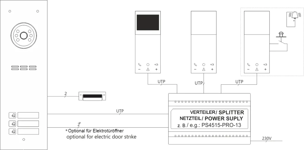 | Eingänge | 1 x RJ45 Buchse 5 x Schraubverbindungen (Anschluss des PRO Systembusses): – Audiosignal Anschluss: „LINE“ – Spannungsversorgungsanschluss: “ + DC“ und „-DC“ „- Anschluss Videosignal: „V +“ und „V-“ 1 x „RING“ Schraubanschluss: – Anschluss Schließer (Schließer), z nach Kurzschließen auf GND des Systems) |
